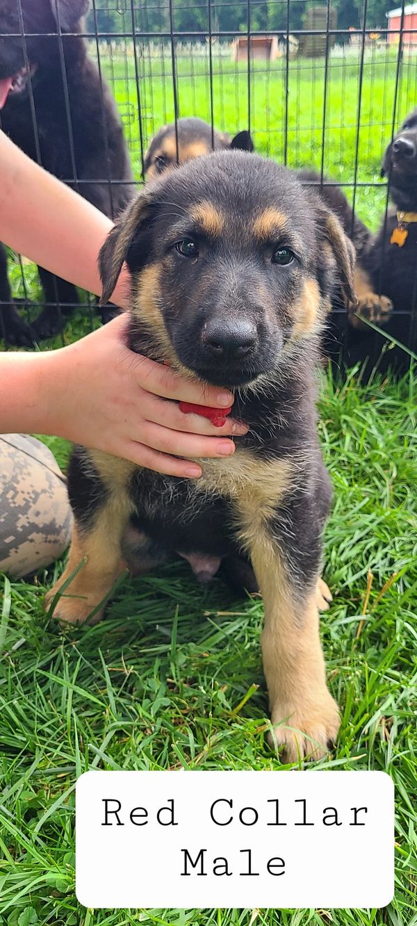 German Shepherd puppies go through color stages when growing up. Their coat is first mostly black and they only have tan socks. Eyes should open for the first.